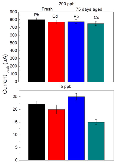 The stability of the GP_naf_ex_Bi electrode was evaluated by measuring the current response after 75 days from the preparation. The test has the aim to estimate the storage time at room temperature of electrodes for their reliable use. Before use, the aged electrodes were re-hydrated by soaking overnight into acetic buffer solution at pH 4.5. Alternatively, they can be stored in wet condition into a sealed sachet. Figure 7 reports the histogram of the current response for the simultaneous detection of Cd2+ and Pb2+ at the concentrations of 200 and 5 ppb, registered by fresh and 75 days stored electrodes, respectively. Little variation, always within the experimental error, in the current response was observed by the aged electrodes, indicating, however, good stability. The stability is competitive with that of some literature references, e.g., tested after only 15 days of storage at 5 °C, which retains about 96% of the initial response [28].