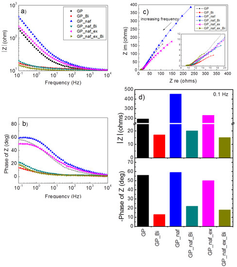 The observed variation in the impedance modulus and phase can be related to the physico-chemical properties of the electrodes. The GP_naf_Bi electrode shows an increasing of the impedance modulus and phase with respect to GP_Bi. This may be related to the presence of ionomer layer not completely saturated by Bi3+/Bi°. In fact, the duration of bismuth electro-deposition (1200 s) may be insufficient for the complete diffusion of Bi3+ into the nafion layer. The key process of the Bi ion exchange step proposed here (GP_naf_ex_Bi electrode) produces a reduction of impedance modulus and phase, in particular at low frequencies. In this case, the overnight soaking into bismuth solution allows to the Bi3+ ions to completely diffuse into the ionomer layer. We reported the histogram that compares the modulus of impedance and phase measured at a frequency of 0.1 Hz in Figure 8d, to facilitate visualization. This frequency is close to that adopted in the SWASV measurements. Low electrode impedance is expected to improve the detection sensitivity, thus the proposed combination of ion exchange and Bi deposition allows an improvement of the electrode performances.