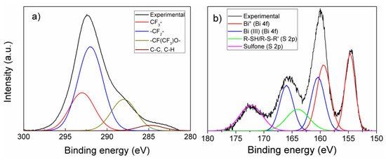 To better understand the chemistry of Pb and Cd detection by the GP_naf_ex_Bi electrode, some specific XPS analyses were performed. Survey XPS spectrum (not shown) exhibits the F, O, C, Na, S and Bi signals. Figure 9a shows the XPS C 1 s core shell spectrum that was deconvoluted by four Gaussian components centered at 293, 292, and 288 eV that are assigned to CF3–, –CF2–, –CF(CF3)O– functional groups, respectively, characteristics of the nafion structure [42,43]. The weak component centered at 284.8 eV can be attributed to adventitious carbon. Figure 9b shows the XPS spectrum in the region of 150–180 eV of binding energy, which comprises the S 2p and Bi 4f core shell signals. The spectrum was deconvoluted using four Gaussian components centered at 154.7 eV (assigned to Bi° 4f7/2), 159.4 eV (Bi° 4f5/2), 160.4 eV (Bi(III)-sulfone 4f7/2) and 166 eV (Bi(III)-sulfone 4f5/2). Moreover, two additional components at binding energy of 164 eV and 172.3 eV (each formed by not resolved S 2p1/2 and S 2p3/2 doublets) were assigned to R-SH/R-S-R’ and sulfonic group, respectively [43]. The R–SH group is formed during electrochemical reduction at the bismuth deposition step. The –SH group has a high binding affinity towards lead and cadmium ion, which acts as chelating specie, further improving the electrode sensitivity [44]. The XPS spectrum of Figure 9b suffers from differential charging up, because of the insulating nature of nafion in the dry condition and the presence of nanoparticles of metallic bismuth. As consequence of the differential charging up, the binding energy assigned to Bi° 4f7/2 and R–SO3− S 2p are slightly different with respect to the literature references. The differential charging up effect, often, is a powerful tool and helps in the structural study of nanomaterials [45,46]. The observed differential charging up between the Bi 4f components assigned to Bi° and Bi(III), respectively, in the spectrum of Figure 9b, confirms the presence of bismuth in the forms of Bi(III) as well as in the metallic Bi°. Component peak areas were used to calculate the concentration of bismuth in comparison to the sulfur groups, as far as the chemical composition of the first layers can be measured relatively to the technique resolution. Atomic sensitivity factors of 9.19 and 0.668 for Bi 4f and S 2p, respectively, were used [47]. The relative composition of Bi°, Bi(III) and sulfur containing groups is reported in Table 3. The overall amount of bismuth (at.%) is about one third of the amount of sulfur containing groups.