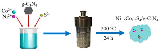 The Ni1.5Co1.5S4/g-C3N4 composites were prepared through a modified one-step hydrothermal method as described in our previous paper [28]. Typically, 3 mmol of NiCl26H2O, 3 mmol of CoCl26H2O and 20 mmol of CS(NH2)2 were dispersed in a mixture solution of 30 mL water and 50 mL ethylene glycol. Then, 60 mg of g-C3N4 nanosheets was added to the above solution and stirred magnetically for 30 min. The pH value of the mixed solution was adjusted to 11 using NaOH. Afterwards, the mixed solution was transferred into a 100 mL Teflon-lined stainless-steel autoclave (Xi’an Changyi Instrument Equipment Co., Ltd, Xian, China) and reacted at 200 °C for 24 h. After cooling to ambient temperature, the black precipitates were collected, washed with deionized water and ethanol several times, and dried at 60 °C for 12 h. The preparation process is shown in Figure 1.