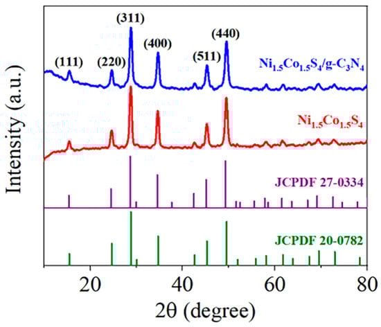 The phase purity and crystal structure of the samples were analyzed using XRD patterns, and the results are shown in Figure 2. Six diffraction peaks can be perfectly indexed to the (111), (220), (311), (400), (511) and (440) of spinel structured NiCo2S4 (JCPDS# 20-0782) or Ni2CoS4 (JCPDS# 24-0334), respectively. In addition, no other metal sulfides such as NiS and Ni3S2 were observed in the pattern, which indicates the pure spinel structure. Figure S1 shows the XRD pattern of the prepared g-C3N4. Two diffraction peaks at around 13.1° and 27.3° in g-C3N4 correspond to the in-plane structure packing of aromatic systems of (100) plane and the interlayer stacking of conjugated aromatic systems of (002) plane, respectively [30,31], which reveals that the prepared g-C3N4 nanosheets is the typical graphitic structure. No diffraction peaks of g-C3N4 were found in the XRD pattern of the Ni1.5Co1.5S4/g-C3N4, which is probably due to weak scattering intensity and relatively low content of g-C3N4.