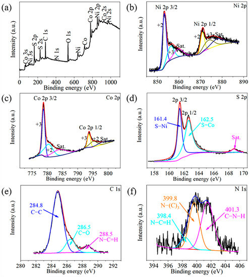 X-ray photoelectron spectra (XPS) of the Ni1.5Co1.5S4/g-C3N4: (a) survey spectrum; (b) Ni 2p; (c) Co 2p; (d) S 2p; (e) C 1s and (f) N 1s.