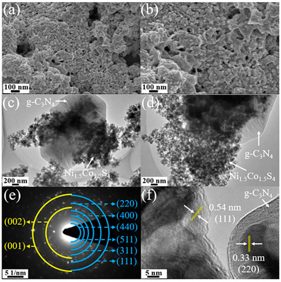 (a,b) SEM images; (c,d) TEM images; (e) SAED (selected area electron diffraction) pattern and (f) TEM image of the Ni1.5Co1.5S4/g-C3N4.