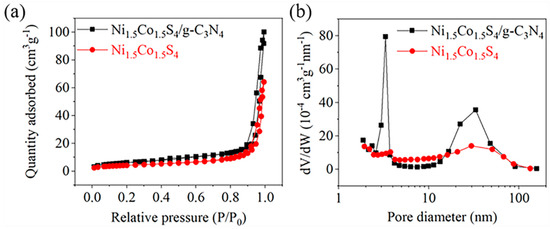 (a) Nitrogen adsorption-desorption isotherm and (b) Pore-size distribution curves of the Ni1.5Co1.5S4 and the Ni1.5Co1.5S4/g-C3N4.