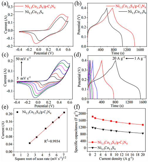 Figure 6 shows electrochemical properties of the samples tested through the three-electrode system. The CV curves was performed at a scan rate of 50 mV s−1 within potential window of −0.4–0.6 V. As shown in Figure 6a, the redox peaks of the Ni1.5Co1.5S4/g-C3N4 is similar to those of the Ni1.5Co1.5S4, which can be attributed to the reversible process of Ni2+/Ni3+ and Co2+/Co3+ associated with the insertion and extraction of OH− anions to and from the electrode materials [38]. The integral area of the CV loop of the Ni1.5Co1.5S4/g-C3N4 is larger than that of the Ni1.5Co1.5S4, indicating superior electrochemical performance. This result can be further confirmed by GCD tests in Figure 6b. Figure 6c,d show the CV and GCD curves of the Ni1.5Co1.5S4/g-C3N4 at different scan rates and current densities. They almost maintain the symmetric shape without visible distort, suggesting that the electrode has excellent pseudocapacitive behavior and high coulombic efficiency. The anodic peak current shows a linear relationship with the square root of scan rate (Figure 6e), which indicates that the electrochemical kinetics is a diffusion-controlled process. The specific capacitances of the samples were calculated at the current densities ranging from 1 A g−1 to 20 A g−1 according to the GCD curves. The Ni1.5Co1.5S4/g-C3N4 composite exhibits a high specific capacitance of 1827 F g−1 at a current density of 1 A g−1 (Figure 6f), which is 1.53 times that of the Ni1.5Co1.5S4 (1191 F g−1). Even if the current density increases 20 times, the specific capacitance still reaches to 1348 F g−1, demonstrating a good rate performance. This result is superior to those of the most recently reported composites such as Ni–Co–S/graphene and NiCo2S4@g-C3N4 composites [36,39]. Moreover, the CV and GCD curves of pure g-C3N4 nanosheets is shown Figure S3 for a comparation. The specific capacitance of g-C3N4 nanosheets is only 11 F g−1 at a current density of 1 A g−1, which is far lower than that of the Ni1.5Co1.5S4/g-C3N4 composite. In order to further explore the effect of g-C3N4 content on the electrochemical properties, the Ni1.5Co1.5S4/g-C3N4 composites with different g-C3N4 content were also prepared and evaluated, shown in Figure S4. When the amount of g-C3N4 is 60 mg, the Ni1.5Co1.5S4/g-C3N4 composite shows the highest specific capacitance, owing to maximizing synergetic effects of Ni1.5Co1.5S4 nanoparticles and g-C3N4 nanosheets. However, the specific capacitance decreases when 90 mg of g-C3N4 is introduced. This superior supercapacitive performance of the Ni1.5Co1.5S4/g-C3N4 can be mainly ascribed to two reasons. On the one hand, g-C3N4 nanosheets can increase the specific surface area and mesoporous number, which provides more active sites for interface reaction and shortens the pathway of the electrolyte ion diffusion. On the other hand, g-C3N4 nanosheets can improve electrical conductivity of the Ni1.5Co1.5S4, which facilitates for electron transport. As shown in Figure S5, the impedance plots imply that the Ni1.5Co1.5S4/g-C3N4 composite possesses smaller internal resistance, faster ion diffusion process and lower charge transfer resistance during the faradic reaction.