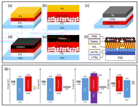 Some commonly employed HTM-free PSC structures in previous works are shown in Figure 2a–f. We categorize these configurations into two different types: (i) with metal top electrodes; and (ii) carbon-based HTM-free configuration. The corresponding energy band diagrams are given in Figure 2g. It can be observed that there is a very small difference in the work function of carbon (−5.0 eV) and Au (−5.1 eV), making carbon an ideal choice to replace Au as the counter electrode and a fully printable HTM-free PSC structure (monolithic PSC) can be fabricated [37]. In the next section, we describe the developments related to each architecture one by one.
