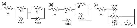 Electrical equivalent circuits used for impedance spectra modeling representing two-time constants in the Nyquist plot: (a) Voight circuit; (b) ladder-type circuit (Matryoshka); and (c) Maxwell circuit.