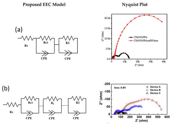 Han’s group fabricated HTM-free fully printable mesoscopic PSC with a mixed anion perovskite (CH3NH3PbI(3−x)(BF4)x) and used EIS tool to compare it with the single anion perovskite-based HTM-free PSC device [32]. The EIS results show that the transport and exchange resistance at the carbon/perovskite interface, represented by the HF arc, was smaller for the case of mixed anion perovskite-based device, resulting in an increased fill factor (FF) of the device. In addition, the recombination rate in the case of mixed anion perovskite-based device was much lower, as indicated by the larger arc in the LF region, resulting in an enhanced Voc of the device, as illustrated in Figure 12a. They then manipulated the composition of perovskite again by incorporating 30% LiCl with it and achieved a PCE of 14.5% [41]. The EIS tool was used to analyze the interfacial properties, and it was observed that charge transfer resistance and recombination rate reduced dramatically (Figure 12b), resulting in an enhanced FF and Voc.