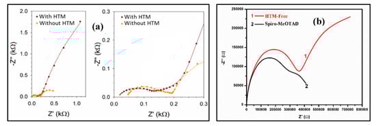 The first article employing the EIS tool to analyze HTM-free PSCs was demonstrated by Juárez-Pérez et al. [25] in 2014. They compared the effect of removing the HTM layer on the performance of the PSCs. Using the EIS (at 0.1 V biasing), the values of series resistance (Rs), recombination resistances (Rrec), and charge transfer resistance (Rct) (see Figure 7a) and their effect on Voc, fill factor (FF), and PCE can be determined. Raminafshar et al. [28] also performed EIS analysis at different biasing (at 0 V, as well as close to open-circuit voltage) in dark and illumination to compare carbon-based monolithic HTM-free PSCs with the effect of HTM on PSCs. Their EIS analysis has shown that the absence of an HTM layer causes a higher electrons holes recombination (see Figure 7b) due to the lack of an electron blocking effect at the perovskite/counter electrode interface. Moreover, the FF also decreases due to the higher Rs value in the absence of HTM. Similarly, Khan et al. [68] also performed a study on the impact of HTM layer in PSCs by EIS technique which also showed a lower recombination resistance in the case of HTM-free PSC devices.