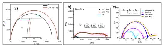 Nyquist plots of carbon counter electrode-based HTM-free PSC: (a) without and with 0.1% CuS incorporated carbon-based HTM-free PSCs (Reproduced with permission from [76]. Elsevier, 2018.); and (b,c) without WO3 additive and with WO3 additive. (b) Reproduced with permission from [44]. Royal Society of Chemistry, 2014. (c) Reproduced with permission from [29]. American Chemical Society, 2020.
