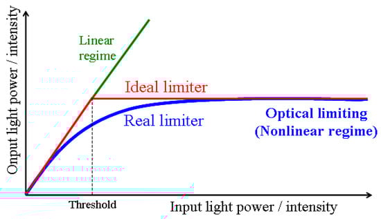 Passive optical limiting (OL) functionality is based on the nonlinear optical (NLO) absorption process specific to certain NLO materials. Such an OL material shows a linear increase in the transmitted intensity/fluence of the laser beam with the incident one below a certain threshold, while above it, the transmitted intensity/fluence remains constant and independent of that of the incident laser beam. The OL functionality is schematically shown in Figure 1 for an ideal optical limiter (red curve) and for a real one (blue curve).