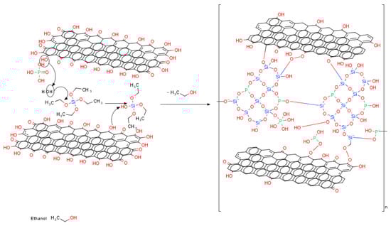 A proposed schematic representation of the reactions for the graphene oxide embedment into the SiO2-P2O5 glassy film is presented in Figure 2.