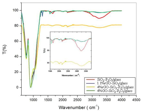 In the 4%rGO-SiO2-P2O5 sample, the vibrational bands at 2920–2846 cm−1 were not clearly solved and a broad band centred at ~2900 cm−1 was noticed and attributed to the hydrogen inter-layer bonds with water molecules [48].