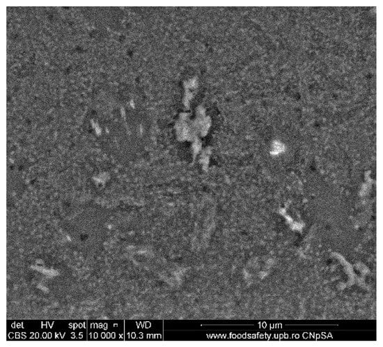 A selection of SEM images is presented in Figure 10, Figure 11 and Figure 12. The 1.1%rGO-SiO2/glass film was less homogeneous than 1%rGO-SiO2-P2O5/glass one, as presented in Figure 10, Figure 11 and Figure 12, giving evidence of phosphorus pentoxide contribution in the distribution of rGO in the silico-phosphate matrix. This is in agreement with the AFM studies.