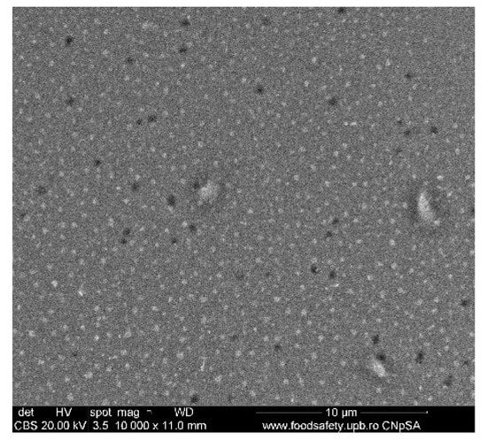 The chemical structure of the samples was investigated using FTIR spectroscopy (with a Spectrum 100 spectrophotometer provided with Universal Attenuated Total Reflectance (UATR) accessory (Perkin Elmer, Llantrisant, UK), in the range 550–4000 cm−1, with a resolution of 4 cm−1 and 10 scans, with Atmospheric Vapour Compensation (AVC), and Raman spectroscopy (Nicolet Almega XR, UK-Thermo Fisher Scientific, Oslo, Norway) with an excitation source of λ = 488 nm, a spot of 3 µm diameter and a power of 5 mW at the sample surface. For morphological investigations, atomic force microscopy (AFM) (XE-100 type from Park Systems, Europe GmbH, Mannheim, Germany, non-contact mode) and scanning electron microscopy (SEM) with energy-dispersive X-ray (EDX) analysis using a FEI Inspect F50 system (FEI Europe B.V. Eindhoven, Netherlands) were used. The spectral dependence of the transmittance was investigated using a UV/VIS/NIR spectrophotometer (Perkin Elmer, Lambda 1050, Llantrisant, UK).