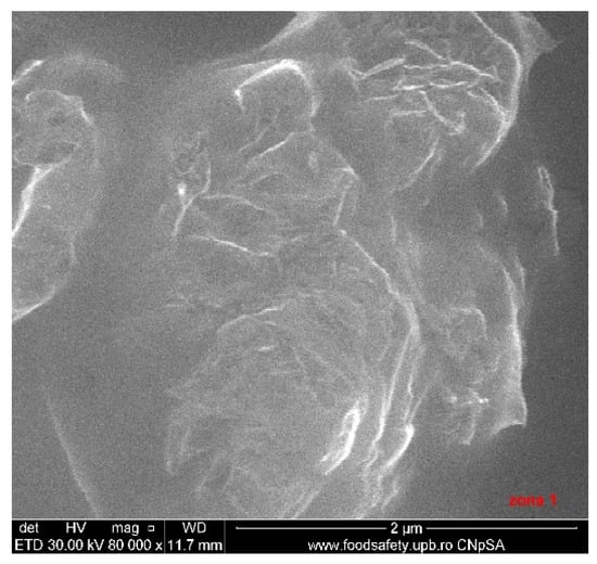 The Raman spectra of the synthesized films presented in Figure 16 show the characteristic peaks for graphene derivatives, namely, the G band at approximately 1600 cm−1 originating from the in-plane vibration of sp2 carbon atoms and the D band associated with edge planes, defects and disordered structures of carbons found in graphene sheets at 1350 cm−1. The broad D peak suggests a highly disordered regime including the structural imperfections created by the attachment of hydroxyl and epoxide groups on the carbon basal plane [52,53,54,55].