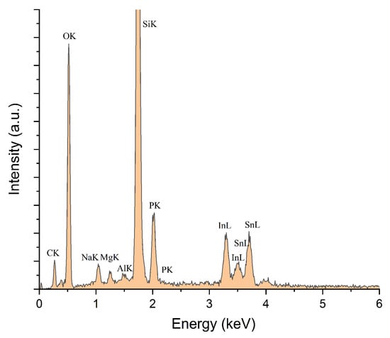 EDX spectra of 4%rGO-SiO2-P2O5/ITO film corresponding to the SEM image from Figure 12.