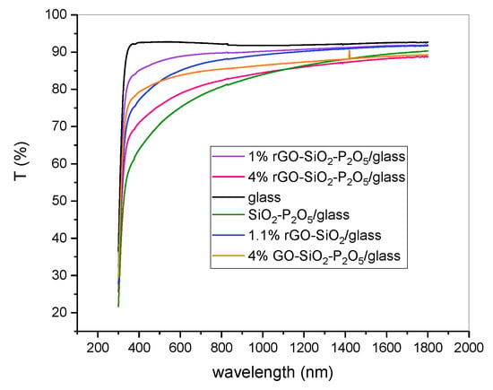For films deposited on the glass substrate (Figure 14), the samples containing rGO/GO exhibited a transmission above 85% for λ longer than 1100 nm and followed the general trend of the SiO2P2O5-glass sample. For wavelengths longer than this value, the transmission decreased with increasing rGO content. For the same concentration of 4%, the film with the rGO content exhibited a higher absorbance than that of that with GO, as expected. The transmittance of the two samples with quite similar rGO content (1 and 1.1%) was higher for the sample that contained phosphorus pentoxide (P2O5) than for the sample without P2O5, for all wavelengths. The difference between the two spectra tends to be negligible for wavelengths longer than 1200 nm.