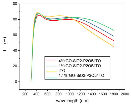 The transmittance of all the samples deposited on the ITO-coated glass substrate (Figure 15) followed the trend line of this particular type of substrate. For longer wavelengths (1100–1800 nm), the increase in rGO content induced a decrease in transmittance, as can be seen from the two spectra of the samples containing P2O5, with 1%rGO and with 4%rGO, respectively. In the same spectral range (1100–1800 nm), the transmittance of the two samples with quite similar content of rGO (1% and 1.1%) was higher for the sample without P2O5, (1.1%rGO) than for the sample with P2O5 (1%rGO), and the difference was larger for longer wavelengths. For both films on ITO-coated glass (1.1%rGO, without P2O5) and (1%rGO, with P2O5), the transmittance did not decrease under 60% in the considered NIR spectral range.