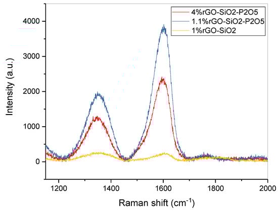 The two small broad peaks near ~2920 and ~2846 cm−1 observed in the samples with GO (4%GO-SiO2-P2O5) and in the ones without P–O (1.1%rGO-SiO2) were attributed to the stretching vibrations of C–H in –CH–OH and –CH–COOH belonging to graphene oxide and overlapping with the hydrogen-bonded OH groups of dimeric COOH groups and intra-molecular-bonded O–H stretching of alcohols, respectively [45]. Additionally, small peaks at ~1560 and ~1595 cm−1 visible in the FTIR spectrum of the same samples (4%GO-SiO2-P2O5 and 1.1%rGO-SiO2) were attributed to the deformation modes of absorbed water molecules’ δ(H–O–H) and O-H groups linked to the –C=O stretching vibration of carboxylic and/or carbonyl moiety functional groups and of skeletal vibrations from un-oxidized graphitic domains from rGO or GO [45,46,47].