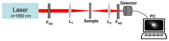The laser source is an Er-doped fibre laser (Toptica), which generates ultrashort pulses (~150 fs pulse duration) with a repetition rate of 76 MHz, at the wavelength λ = 1550 nm. The maximum average power is ~230 mW, and the corresponding peak power and the pulse energy of the generated laser pulses are ~19 kW and ~3 nJ, respectively. The lens L1 (focal length = 2.54 cm) focuses down the laser beam on a spot of 13 μm diameter on the investigated sample, which is placed in its focal plane. The intensity of the laser beam incident on the sample is varied by changing its power only with neutral density filters (FND) (Thorlabs, Munich, Germany), with the transmission specially calibrated by us at the wavelength of the laser (λ = 1550 nm). Using the lens L2, the spot size of the transmitted laser beam is adjusted relative to the aperture of the detector used to measure the beam average power. The lenses L1 and L2 and the sample are mounted on micrometric translation stages for the fine tuning of their positions. The average powers of the incident and of the transmitted beams were measured using a FieldMax II-TOP power meter (Coherent, Portland, OR, USA) with a type OP-2IR detector (Coherent, Portland, OR, USA). All the measured powers, the incident and the transmitted ones, were corrected for Fresnel reflections. Neutral density filters were also used in front of the detector in order to keep the power of the measured light signal below the maximum power measurable with the detector. The incident average laser powers in the available range are below the values for which the laser-induced damage could appear, as seen in investigations with an optical microscope.