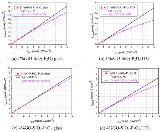 In order to investigate the OL capability of the GO/rGO composite glassy films, the values of the transmitted peak intensities, , were measured as a function of the incident peak intensities, , for the entire range of of the available laser source. A deviation from the linear transmittance towards lower values of transmittance is indicative of the optical limiting behaviour [27,28,56].