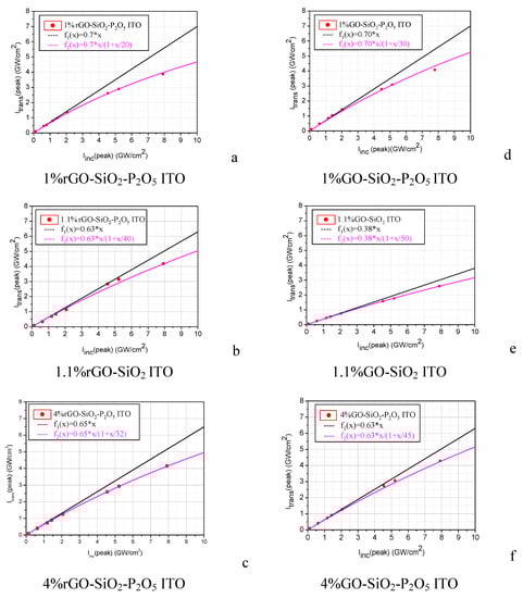 The experimental transmittance results, considering the incident, , and the transmitted, , peak intensities of the laser pulses, are shown in Figure 19a–f, for the films deposited on ITO-coated glass substrates for the two categories of the investigated silico-phosphate composite samples, with rGO (Figure 19a–c) and with GO (Figure 19d–f), respectively.
