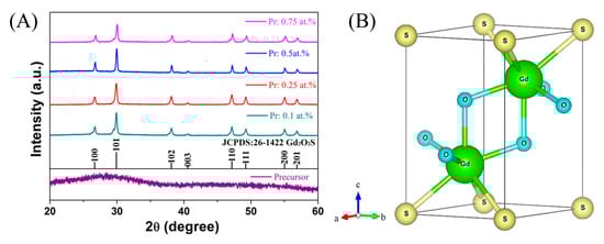 Figure 1A shows the XRD patterns of the precursor powder and reduction products. An amorphous precursor was obtained via the chemical precipitation route. The reaction temperature of 80 °C with an aging time of 1 h is not enough for its crystallization. Upon calcination at 1000 °C under a hydrogen atmosphere, all diffraction peaks of the products can be well indexed to hexagonal Gd2O2S (JCPDS No. 26–1422) without any impure phases, indicating that the precursor fully converts into oxysulfide via thermal decomposition and reduction reaction. Its schematic crystal structure drawn by VESTA 3D visualization software is shown in Figure 1B. Only one coordination type for Gd3+ exists in the unit cell, that is, each Gd3+ is surrounded by four oxygen atoms and three sulfur atoms to form a seven-coordination polyhedron [39]. After Pr3+ incorporation, it would substitute the Gd3+ site because of their similar ionic radii (0.0990 nm for Pr3+ with CN = 6 and 0.0938 nm for Gd3+ with CN = 6). Along with increasing Pr3+ addition, remarkable shifts of diffraction peaks were not observed due to the low Pr3+ concentration and small difference in ionic radii between Pr3+ and Gd3+. The average crystallite size (DXRD) can be calculated by the Debye–Scherrer formula: d = 0.89λ/[(B02 − Bc2)1/2∙cosθ], where B0 is the half-peak width, Bc is the correction factor caused by instrument broadening, θ is the angle of the diffraction peak, and λ is the wavelength of the X-ray [40]. The resulting DXRD values calculated from (101) diffractions are ~35.7, 32.3, 58.0, and 47.7 nm for the samples doped with 0.1, 0.25, 0.5, and 0.75 at.% Pr3+, respectively.