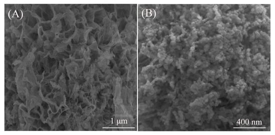 FE-SEM micrographs showing morphologies of the precipitation precursor (A) and its reduction product at 1000 °C (B).