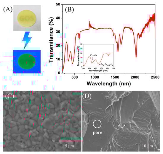 Appearance (A) and in-line transmittance (B) of the GOS:Pr ceramic scintillator, and SEM micrographs of the surface (C) and fracture surface (D) of the sintered ceramic. The lower part in panel (A) is the appearance of GOS:Pr ceramic under irradiation from a 254 nm UV lamp. The inset in panel (B) is the enlargement of its in-line transmittance curve from 200 to 700 nm.