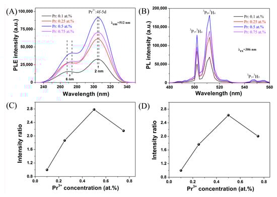 Photoluminescence excitation (PLE) (A) and photoluminescence (PL) (B) spectra of (Gd1−xPrx)2O2S (x = 0.001–0.0075) phosphor powders, PLE intensities of the 306 nm excitations normalized to 1 for the lowest value (C), and PL intensities of the 512 nm emissions normalized to 1 for the lowest value (D).