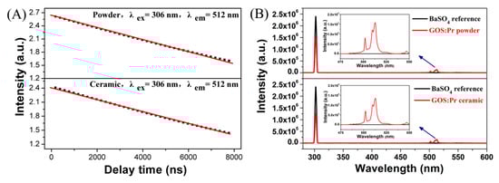 Fluorescence decay behaviors of the GOS:Pr phosphor powder and scintillation ceramic for the 512 nm Pr3+ emission under 306 nm excitation (A) and their quantum efficiency spectra obtained under 306 nm excitation (B).