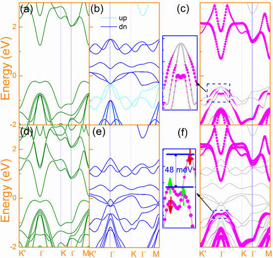 Manipulating exchange interactions in magnetic heterostructures has been proven to be an effective way to engineer highly functional materials. It has been shown that only a tiny valley Zeeman splitting of 0.1–0.2 meV/T can be achieved using an external magnetic field for almost all TMDCs, due to their similar electronic structures and the same orbital moment contributions [14,15]. On the other hand, the exchange valley splitting by MPE can generate fairly large tunable Zeeman splitting, which depends on the exchange interaction strength between the magnetic substrate and TMDCs, the interlayer separation and band alignment [16]. So far, there are intense studies of 2D materials to achieve the valley splitting via proximity exchange effect [17,18,19,20,21,22,23,24,25]. Theoretical work has predicted strong exchange effects and emergent phenomena in the systems integrating 2D materials with magnetic substances. For instance, many investigations have been performed for TMDCs on magnetic substrates such as EuO [17], EuS [18], MnO [20,21], CoO [19], Cr2O3 [22], and CrI3 [23,24,25], as well as other 2D systems: SnO/CrN [26], and 2H–VS2/Cr2C [27] to study their interfacial magnetic exchange effect. In addition, the in-plane strain, the vertical electric field and the layer separation can be used to further manipulate and modulate valley splitting in some of the above systems [16,21]. The MPE in TMDCs-based systems are facilitated via the d–d orbital interaction from the transition metals involving both the substrate and the functional layers. A natural question arises: can one exploit the exchange interaction to tune both the magnitude and sign of valley splitting of a 2D material without valence d–d interaction? The answer to this question will help to deepen the understanding of the origin of the MPE.