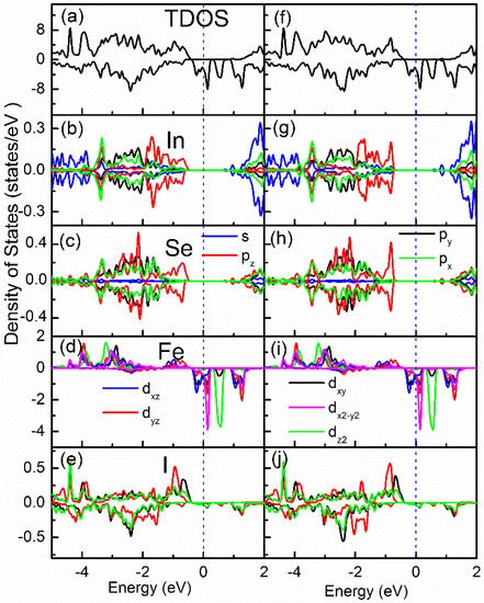 To reveal the contributions of different atomic states at the band edges, the total density of states (TDOS) and orbital-resolved partial density of states (PDOS) of InSe/FeI2 are compared in Figure 4 for C-1 and C-3. It shows that the spin-up and spin-down states are well separated, and the Fe spin-down orbitals have negligible hybridization with InSe in valence bands. The VBM of InSe are mainly constructed by the In and Se pz orbitals, which agrees very well with previous reports [48,49]. From Figure 4, we see that tha I atom is antiferromagnetically coupled with the Fe atom. Thus, the spin-down orbitals are lower in energy than the spin-up ones. The antiferromagnetic interaction between Fe and I implies that the magnetic exchange mechanism of FeI2 can be super-exchange. Furthermore, the Fe–I–Fe bond angle is very close to 90° (91.6°). Therefore, the ferromagnetic super-exchange is allowed based on Goodenough-Kanamori rules [50]. Comparing C-1 and C-3 configurations, it is found that In and Se atoms in C-1 have relatively large spin asymmetry at the VBM. For example, in Figure 4b,c, the spin-down states for both In and Se atoms are a bit lower in energy than their corresponding spin-up states due to the hybridization with the I atom. This behavior can be almost ignored in C-3. Due to the lack of band splitting, the van Hove singularity in C-3 is more pronounced. There is strong hybridization between the In px, py and Se px, py orbitals, which are located at ~1.5 eV away for the VBM of InSe. At the VBM of InSe, there are purely pz orbitals. Therefore, it is concluded that the In pz and Se pz states around the kn and kn′ points play a key role in the valley splitting.