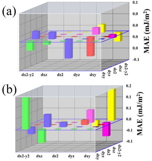 where ξ is the spin-orbit coupling constant, |o> and |u> indicate the occupied and unoccupied states, respectively. Eo and Eu are the eigen-energies of the occupied and unoccupied states, respectively. And and are angular momentum operators in x and z directions. The small energy separation (Eu − Eo) between the occupied and unoccupied states is responsible for the variation in MAE [46]. The d-orbital-resolved MAE is determined by the spin-orbit matrix element differences and their difference in energy between in-plane and out-of-plane [27,47].