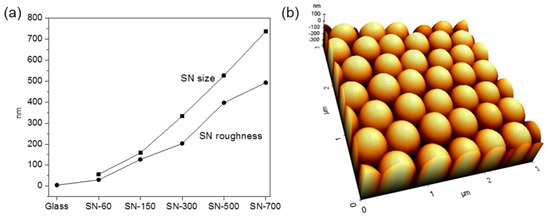 (a) Sizes of silica nanoparticles and roughness of silica nanostructured substrates (SN); (b) atomic force microscopy (AFM) image of SN-500.
