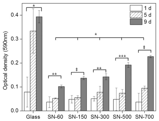 Optical microscopic images of rMDSCs grown on SN (Figure 3) showed that after culturing for 1 day, rMDSCs were difficult to observe on SN-60, SN-150, and SN-300. In most cases, attached rMDSCs were detected on these surfaces only after 5 days and exhibited a round shape. Few filopodia were evident even after 9 days, and they did not form any branches or planar enlargements. In contrast, rMDSCs grown on SN-500, SN-700, and glass plates formed many filopodia and adhered to the substrate even after 1 d (Figure 3d–f). rMDSCs showed some flat, spread-out areas that increased contact with the substrates, and most filopodia on these rMDSCs were highly branched.
