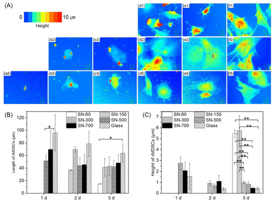 Confocal microscopic analysis of the length and height of rMDSCs grown on different SN and glass at 1, 2, and 5 days. (A) Confocal microscopic images; color corresponds to cell height from low (blue) to high (red). (a) SN-60, (b) SN-150, (c) SN-300, (d) SN-500, (e) SN-700, and (f) glass. The numbers indicate 1, 2, and 5 days. Magnification, ×1000; scale bar = 15 μm. Quantification of the results of (B) length and (C) height of rMDSCs shown in (A). Data of length and height of rMDSCs were analyzed by one-way ANOVA with Bonferroni’s multiple comparison (* p < 0.01, ** p < 0.001).