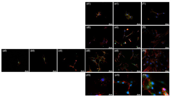 Actin–integrin β1 immunostaining in rMDSCs grown on SN for 1, 5, and 9 days. (a) SN-60, (b) SN-150, (c) SN-300, (d) SN-500, (e) SN-700, and (f) glass. The numbers indicate 1, 5, and 9 d. Blue, DAPI; red, actin; green, integrin β1. Magnification, ×400; scale bar = 50 μm. (d’9), (e’9), and (f’9) are enlarged images (magnification, ×1000). (The enlarged actin–integrin β1 immunostaining images are shown in Supporting Information Figures S4 and S5).