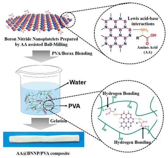 Schematic diagram showing the overall process for preparing the amino acid boron nitride nanoplatelet (AA@BNNP) composites.