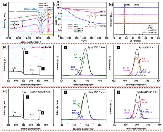 (a) FT-IR spectra of h-BN, BNNP, Lys@BNNP and Glu@BNNP; (b) TGA curves of h-BN, BNNP, Lys@BNNP and Glu@BNNP under a nitrogen flow; (c) XRD patterns of h-BN, BNNP, Lys@BNNP and Glu@BNNP powders; (d) high resolution XPS spectra of as-received Lys@BNNP, with (I) the B1s XPS spectra of the Lys@BNNP and (II) the O1s of the Lys@BNNP; (e) high resolution XPS spectra of as-received Glu@BNNP, with (I) the B1s XPS spectra of the Glu@BNNP and (II) the O1s of the Glu@BNNP.