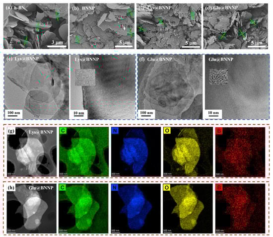 SEM images of (a) h-BN; (b) BNNP; (c) ball milling of Lys@BNNP and (d) ball milling of Glu@BNNP; (e) low-magnification TEM image of Lys@BNNP and high-resolution TEM images of the Lys@BNNP; (f) low-magnification TEM image of Glu@BNNP and high-resolution TEM images of the Glu@BNNP; high-magnification elemental mapping of (g) Lys@BNNP and (h) Glu@BNNP.