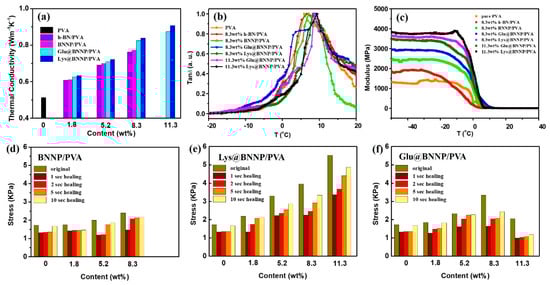 In order to confirm the hydrogen-bonding interaction between −OH groups on PVA chain and −COOH groups, we investigated storage modulus (E) curves and loss factor (tanδ) curves of the PVA composites by dynamic mechanical analysis (DMA) [11]. The mechanical properties of the composites were enhanced by improving the interfacial interaction between the AA@BNNPs and polymer matrix, and by the better dispersion of AA@BNNPs within a polymer matrix. The traces of E and tanδ of PVA composites are shown in Figure 5b,c. As illustrated in Figure 5b, the glass transition temperatures (Tg) acquired from corresponding tanδ peaks of PVA, 8.3 wt% h-BN/PVA, 8.3 wt% BNNP/PVA, 8.3 wt% Glu@BNNP/PVA, 8.3 wt% Lys@BNNP/PVA were 5.9, 6.6, 7.8, 8.3 and 9.1 °C, respectively. Compared with the 8.3 wt% Glu@BNNP/PVA and Lys@BNNP/PVA, the 11.3 wt% Glu@BNNP/PVA and Lys@BNNP/PVA have increased to 8.5 and 9.4 °C. It was concluded that as the Glu@BNNP and Lys@BNNP additional amount increased, the hydrogen-bonding interaction was increased. The Tg of these PVA composites was increased with different fillers, which suggested that the increase of intermolecular interactions was caused by hydrogen bonds [27]. Moreover, the storage modulus was in the order of the PVA < 8.3 wt% h-BN/PVA < 8.3 wt% BNNP/PVA < 8.3 wt% Glu@BNNP/PVA < 11.3 wt% Glu@BNNP/PVA < 8.3 wt% Lys@BNNP/PVA < 11.3 wt% Lys@BNNP/PVA (see Figure 5c). These dynamic properties were dependent on the incorporated fillers, including the hydrogen-bonding interaction between -OH groups on PVA chain and -COOH groups originating from AA moieties [25,34].