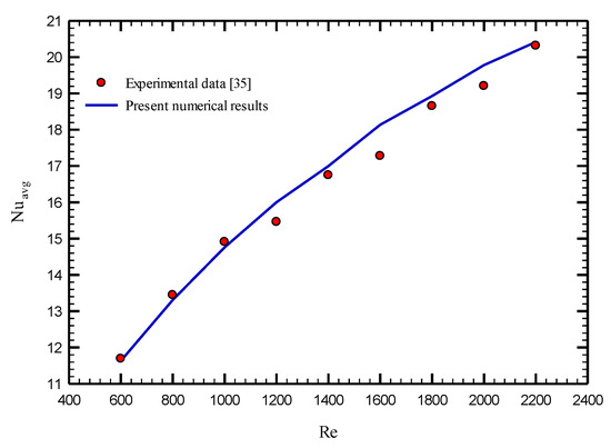 To verify the code, the experimental results of Qi et al. [] for the average Nusselt number for laminar nanofluid flow in a circular tube made of stainless steel using stationary and rotating twisted tapes were used. They used a motor to drive the rotation of the twisted tape which was set to 5 RPM. They experimentally examined different concentrations of TiO2/water nanofluid (0.1%, 0.3%, and 0.5%) at different Reynolds numbers (600–7000) in a circular tube, with inner diameter, thickness and length of 22, 2, and 1400 mm (only the middle section (1000 mm) was used as the test section), respectively, equipped with twisted tape inserts with the length, pitch size, width, and thickness of 1600, 100, 16, and 2 mm, respectively. They chose relatively low mass concentrations of nanoparticles to reach a better stability for the nanofluid. They discussed the results based on the line relationship between the shear stress and shear rate that TiO2 nanofluids can be approximately regarded as a kind of Newtonian fluid, and the non-Newtonian effects can be ignored.