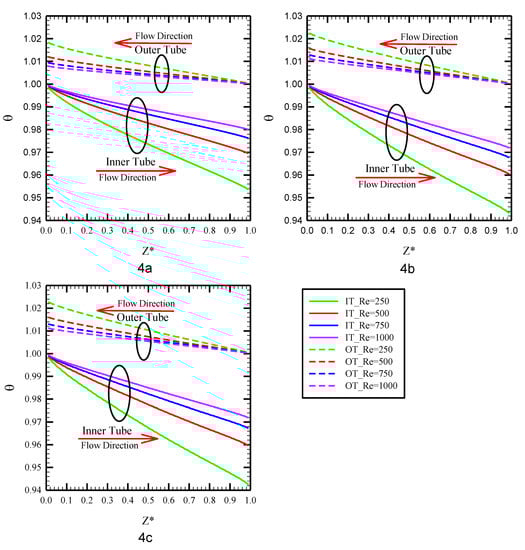 The distribution of bulk temperature in the heat exchanger inner and outer tubes throughout the channel length for water as the working fluid at various Reynolds numbers is displayed in Figure 4. The fluid temperature from the inlet to outlet is different for inner and outer tubes so that the fluid flowing through the outer tube experiences fewer changes than that for the inner tube. The reason is because of the difference in mass flow rate values of inner and outer tubes since the higher mass flow rate at the outer tube causes fewer changes in the fluid temperature along the heat exchanger length. It is also visible that the fluid temperature undergoes more changes in lower Reynolds numbers due to the lower fluid velocity resulting in more time for fluids flowing through the inner and outer tubes from the heat exchanger’s inlet to outlet to exchange heat. Another point that is visible in this figure is that, at a given Reynolds number, the fluid outlet temperature in PHE is different compared with Co-STT and Counter-STT cases so that the twisted tape cases show a higher temperature difference between the heat exchanger inlet and outlet in comparison with the PHE. In fact, at a given Reynolds number, higher variation in fluid temperature from inlet to outlet implies higher heat transferring between the fluid flowing through inner and outer tubes resulting in higher heat exchanger efficiency. As a result, applying twisted tapes in both tubes of the heat exchanger causes a thermal enhancement. The reason is that in the twisted tape cases, secondary flow is created as a result of flow swirling, which consequently improves the flow mixing, disturbs the thermal boundary layer and enhances the heat transfer rate. In other words, the twisted tape redirects the colder core fluid with a better cooling capability to the heat exchanger interface wall causing higher thermal performance of the system.