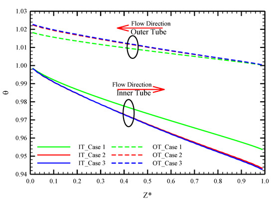 Figure 10 displays the cross-sectional temperature contours for PHE, Co-STT, and Counter-STT at the Reynolds number of 250. The PHE temperature contours show the normal development of thermal boundary layer in both inner and outer tubes as the fluid flows through the unit; however, the temperature contours at the cases of Co-STT and Counter-STT are different so that the thermal boundary layer disturbance occurs and secondary flow and better flow mixing affect the boundary layer causing higher heat exchanger efficiency. Moreover, looking at the temperature distributions at the tubes’ outlet implies the fact that using twisted tape causes a higher amount of fluid to participate in the heat transfer process between the tubes due to the presence of secondary flow and better flow mixing by substituting the fluid near the interface wall with the core fluid and vice versa. Comparing the temperature distribution for the two cases of Co-STT and Counter-STT shows that, in the Counter-STT case, the secondary flow at both tubes causes the regions with thinnest thermal boundary layer in both tubes to be in direct contact with each other and are placed in the same angular direction, resulting in higher thermal performance in comparison with Co-STT case. Thus, the regions in the outer tube with the thinnest thermal boundary layer are in direct contact with the regions in the inner tube with the thickest thermal boundary layer.