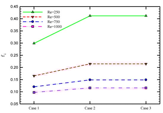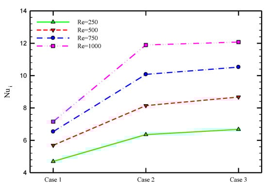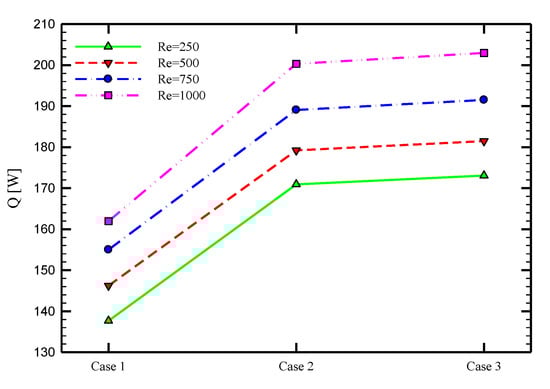 Figure 6 displays the heat flux between the inner and outer tubes for different proposed cases. As shown, the transferred heats for the double-pipe inserts (Cases 2 and 3) are much higher than that for Case 1. Besides, Case 3 has a slight advantage compared with Case 2 according to the transferred heat flux between the pipes. For example, for the Reynolds number of 250 and , the heat flux for Case 3 is 6.67 W, which is 29.62 and 4.82% higher than Cases 1 and 2, respectively.