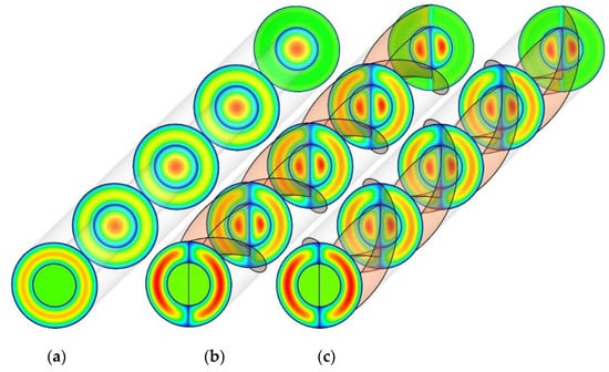 Figure 9 shows the cross-sectional velocity contours for PHE, Co-STT, and Counter-STT at Re = 250. It is visible that applying the twisted tapes at both inner and outer tubes redirects the core fluid with higher velocity and heat transfer capacity to the vicinity of the interface wall causing higher thermal performance. There is no difference between the velocity contours of Co-STT and Counter-STT cases since the direction of the twisted tape does not affect the velocity distribution. In addition, comparing the red colors of different cases, showing higher velocity at the fluid core, it can be implied that the twisted tapes create a secondary flow and better mixing causing higher velocity and advection phenomenon near the interface wall, and, as a result, a higher heat transfer rate is obtained.