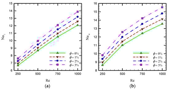 To investigate the effects of Al2O3 nanofluid in the case of Counter-STT, Figure 12 depicts the variations of Nusselt number at the inner and outer tubes in terms of Reynolds number at various volume concentrations of the nanofluid. For all Reynolds numbers, adding nanoparticles to the base-fluid augments the Nusselt number at both inner and outer tubes of the heat exchanger results in the higher thermal efficiency of the heat exchanger. Dispersing nanoparticles modifies the fluid thermal properties, including thermal conductivity, resulting in a higher heat transfer rate.