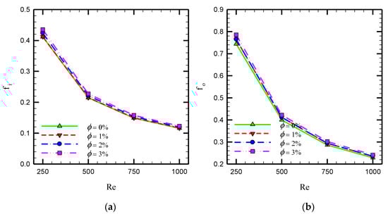 Figure 13 depicts the variations of friction factor at the inner and outer tubes in terms of Reynolds number at various volume concentrations of the nanofluid in the case of Counter-STT. Using nanoparticles enhances the viscosity of the fluid, causing higher friction coefficient magnitudes. Moreover, using nanofluids in such geometries, including twisted tape inserts causing intense flow mixing and secondary flow, seems to be beneficial as it prevents undesirable phenomena, including the possible agglomeration and sedimentation of nanoparticles.